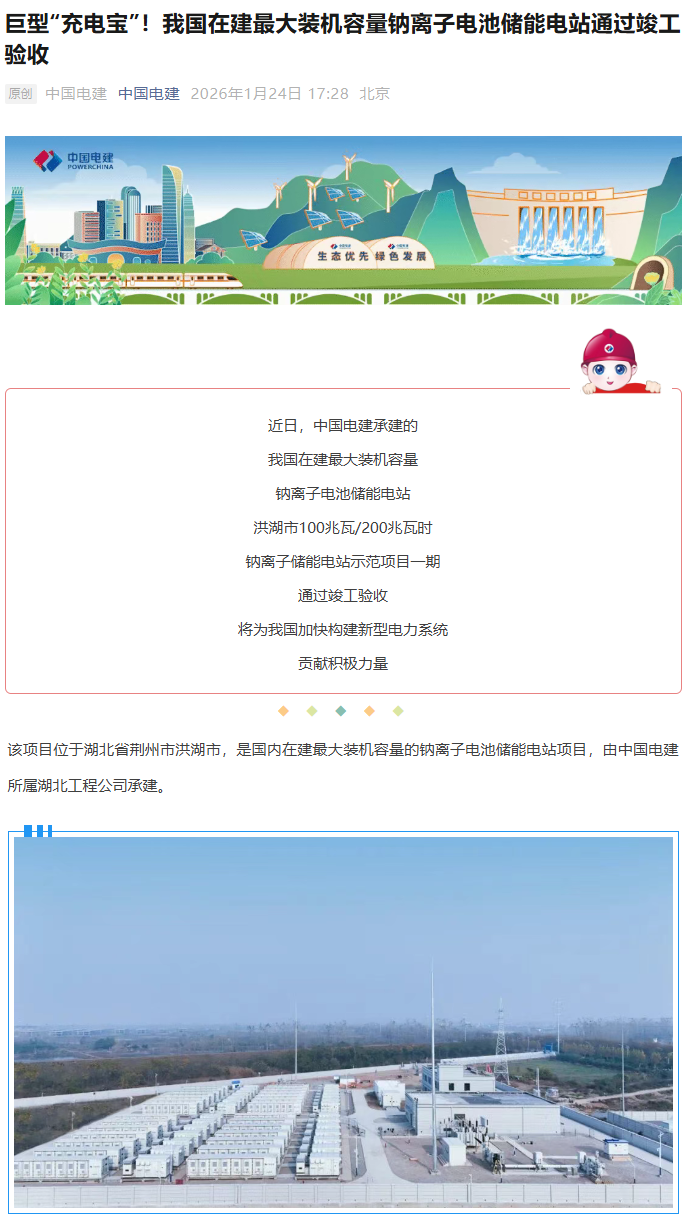 IT之家1月24日音信,据中国电建官方,近日,中国电建承建的我国在建最大装机容量钠离子电板储能电站,洪湖市100兆瓦/200兆瓦时钠离子储能电站示范表情一期通过完好意思验收。
