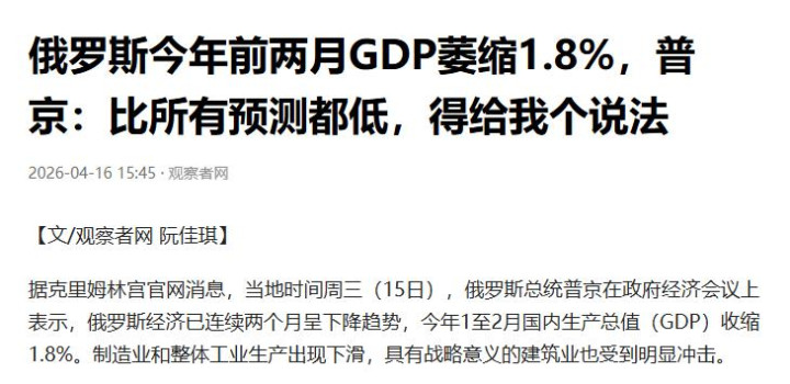 不雅察者网 2026-04-16 俄罗斯本年前两月GDP萎缩1.8%,普京:比统共揣测都低,得给我个说法