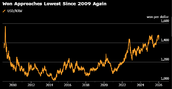 2025年下半年开始以来,韩元兑美元已下跌超过8%。政策制定者采取的一系列措施和市场干预行动未能减缓其向全球金融危机以来最弱水平下滑的趋势。作为贸易协议的一部分,韩国承诺对美累计投资3500亿美元,这加剧了外界对韩国是否有能力支撑如此大规模资本支出的担忧。