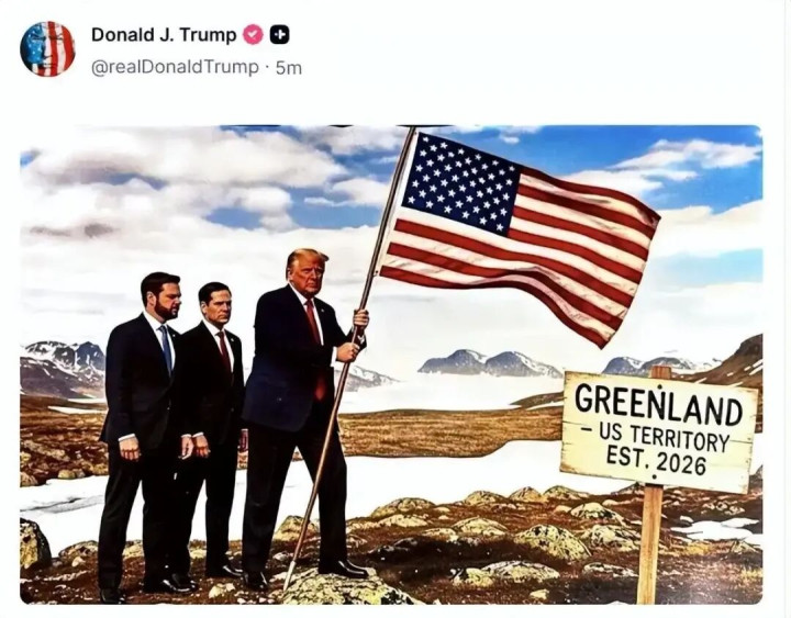 1月20日,据新华国外音讯,好意思国总统特朗普20日凌晨在应答媒体上发布图片,他手拿好意思国国旗登上格陵兰岛,死后站着好意思国副总统万斯和国务卿鲁比奥,傍边辅导牌上写着“格陵兰岛2026年景为好意思国版图”。