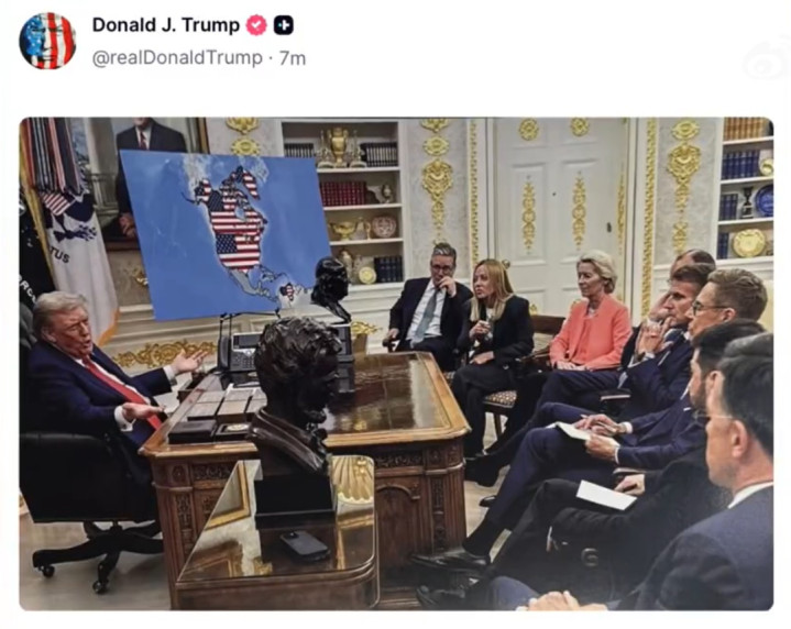 特朗普今日还发布了另一张图片:他在白宫办公室与欧洲引导东谈主会面,背面展板上的舆图中,除好意思邦原土外,加拿大、格陵兰岛和委内瑞拉均被好意思国国旗隐蔽。