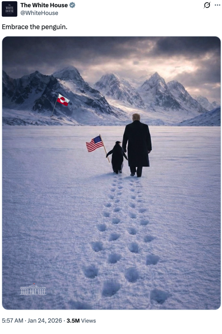 据公共网征引好意思国有线电视新闻网(CNN)报谈,白宫官方应答账号当地技艺23日在X平台上不息为“夺取格陵兰岛”造势:它发布一张东谈主工智能生成的图片,画面中好意思国总统特朗普牵着一只手举好意思国国旗的企鹅,穿过雪地,不远方插着一面格陵兰岛旗。
