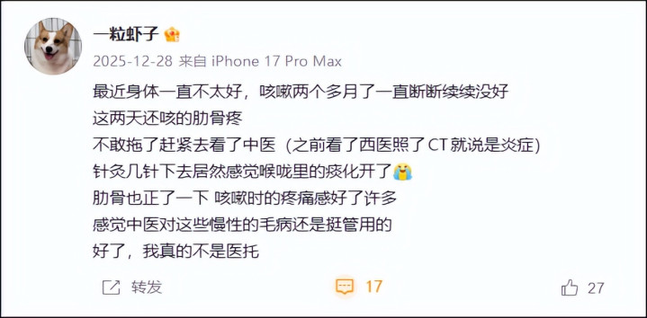 字据其微博帖子发现,2025年末起,“一栗小莎子”握续出现腋下淋巴难受、咳嗽、肋骨不适等症状,初期尝试中医调治(针灸、中药)缓解痛感但后果有限。