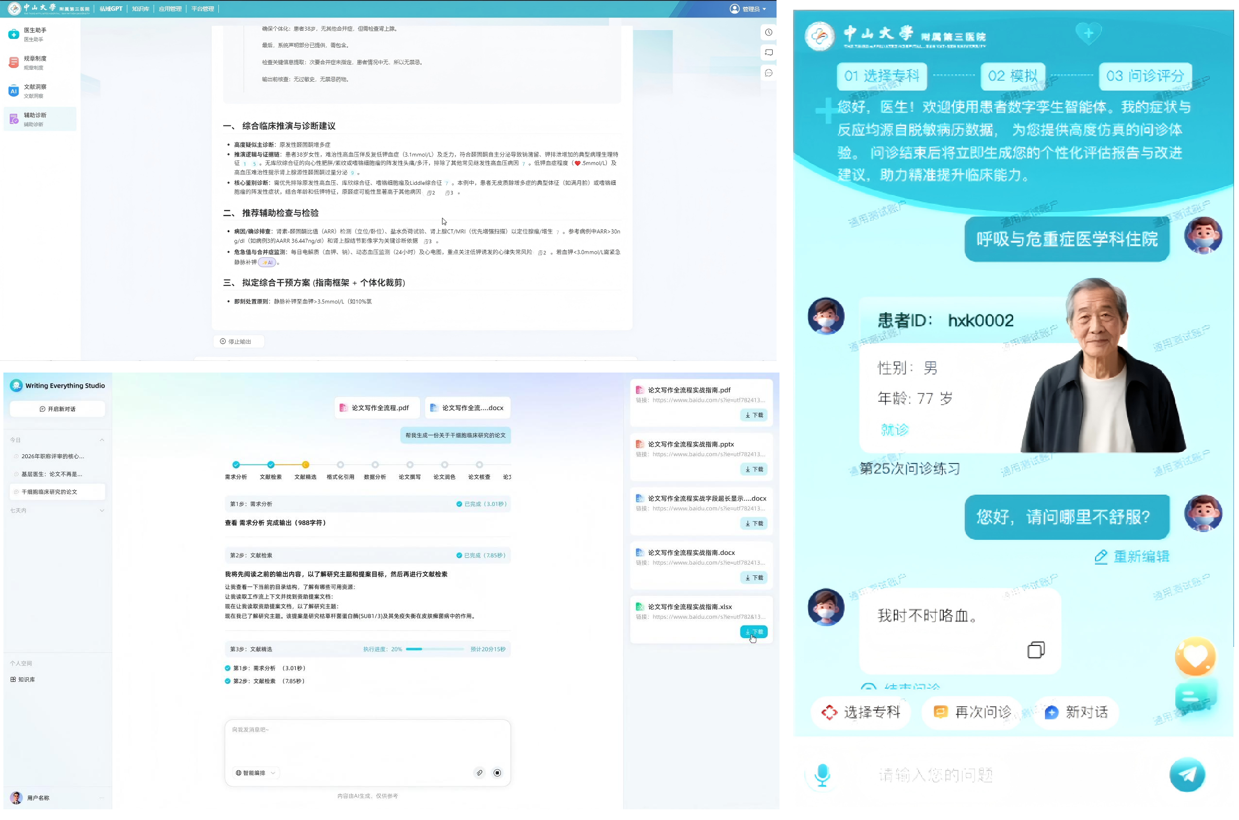 聚焦大数据驱动与东说念主工智能赋能,中山三院医学数据智能实验室(“干实验室”) 负责运转,三款聚焦医疗、教养、科研中枢场景的东说念主工智能居品同步发布:(1)中山三院东说念主工智能大夫:依称疾院百万级临床病历与泰斗学问库,可缓助大夫完成疾病快速初筛、雷同病例保举及个性化诊疗决策决策;(2)AI教养缓助诊疗平台:基于院内真确脱敏病历生成“数字患者”,通过多智能体模拟问诊情景并进行多维度智能评分,为医学生和后生医师提供圭臬化、可交互的临床念念维考试环境;(3)东说念主机陆续科研缓助写稿平台:直击科研经由痛点,完了从选题、文件检索、数据挖掘到初稿撰写、智能审稿的一站式行状,让征询者更专注于科学问题自己。