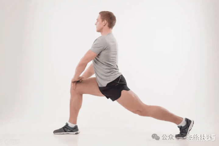 弓步蹲,前后腿呈弓步状向下压,感受背面那条腿的腹股沟在拉伸,独揽双方轮换进行。