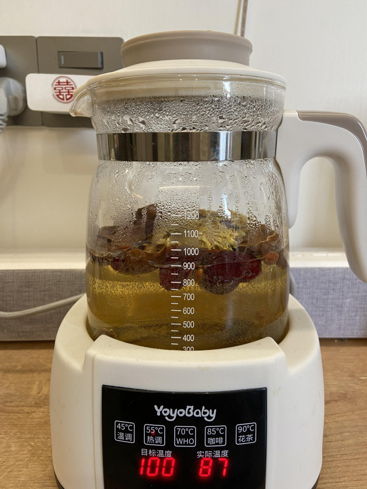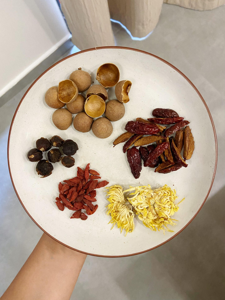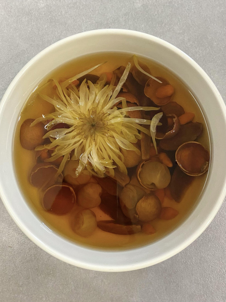 方子就四样:带壳干桂圆6粒、红枣4颗、枸杞一小撮、菊花2朵。别看浅薄,搭配很有肃穆。