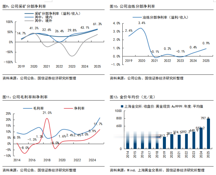 2025全年结束收入131.4亿元(+10.8%),结束溢利15.4亿元(+121.1%)。其中,2025H1结束溢利6.6亿元,2025H2结束溢利8.8亿元,同比增61.2%,环比+32.4%。溢利大幅擢升收货于采矿分部黄金产量同比抓续增长,同期公司连接股东降本增效,重叠黄金市集价钱高涨。