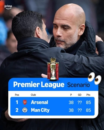 转播方亚马逊列出一种潜在的英超争冠状态:若曼城接下来在英超全胜(包括主场对枪手的凯旋对话),而阿森纳获得除凯旋对话的另外五轮比赛,两边在沿途比赛约束后的比分均为85分,需要比拟净胜球才调决定最终冠军包摄。