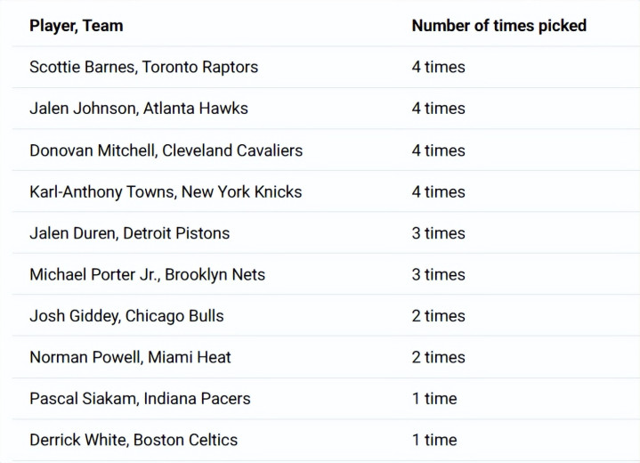4票:米切尔、唐斯、杰伦-约翰逊、斯科蒂-巴恩斯