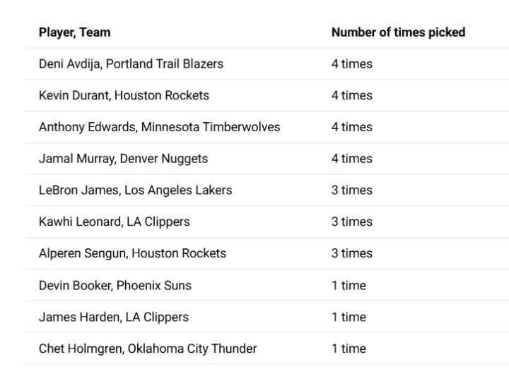 4票:阿夫迪亚、杜兰特、爱德华兹、贾马尔-穆雷