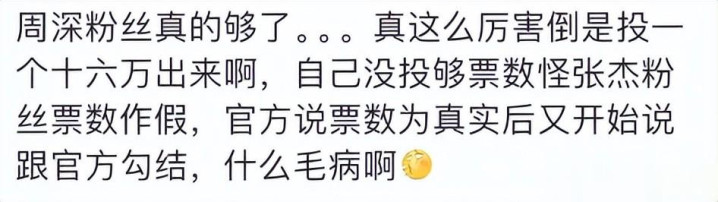 而这群粉丝的质疑原因,便是他们给张杰投的票要比周深的票数多。