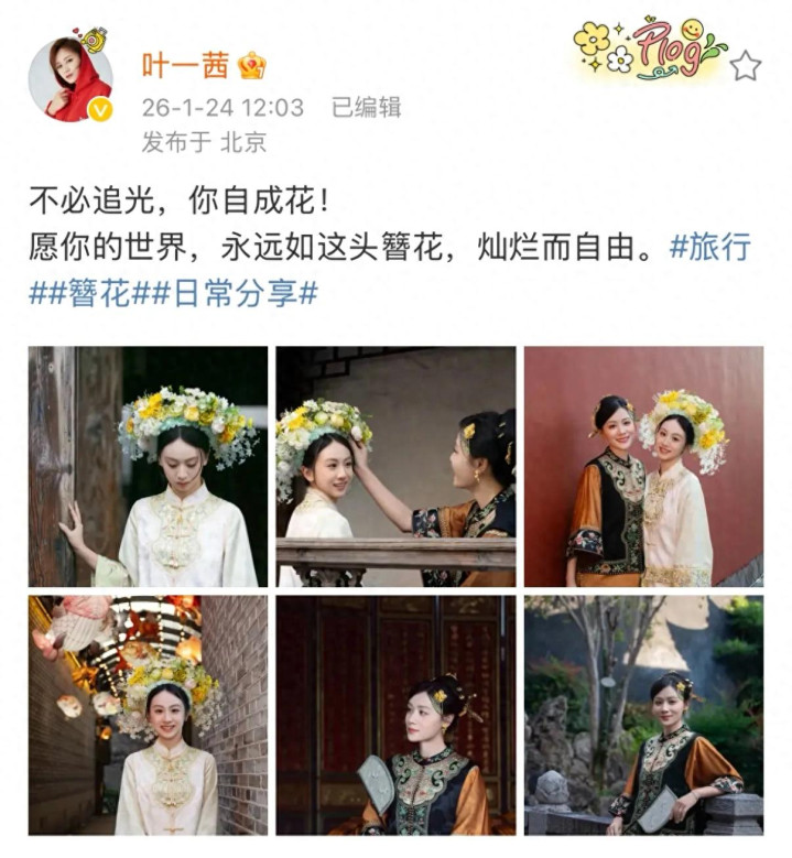 1月24日,叶一茜在搪塞平台晒出一组和犬子森蝶的簪花合照,打卡登科狂妄。母女同框颜值养眼,17岁的森蝶越来越像姆妈。