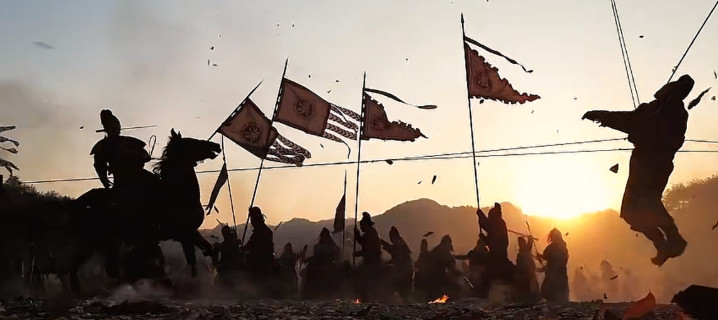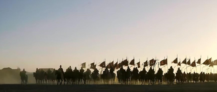 还有巨额逆光、侧逆光愚弄,把东谈主物、战马、旗号拍成剪影,详尽分明,自带欢乐与诗意,像一幅流动的古画。