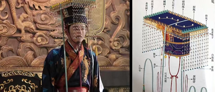 这是是古代最高品级的冠式,中枢等于是冕(冠体)+旒(垂珠)。