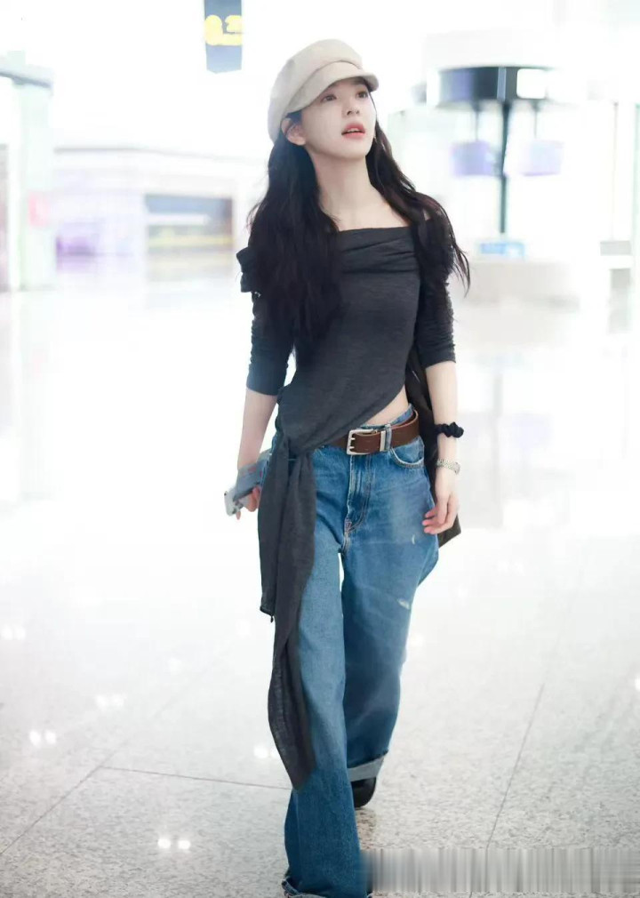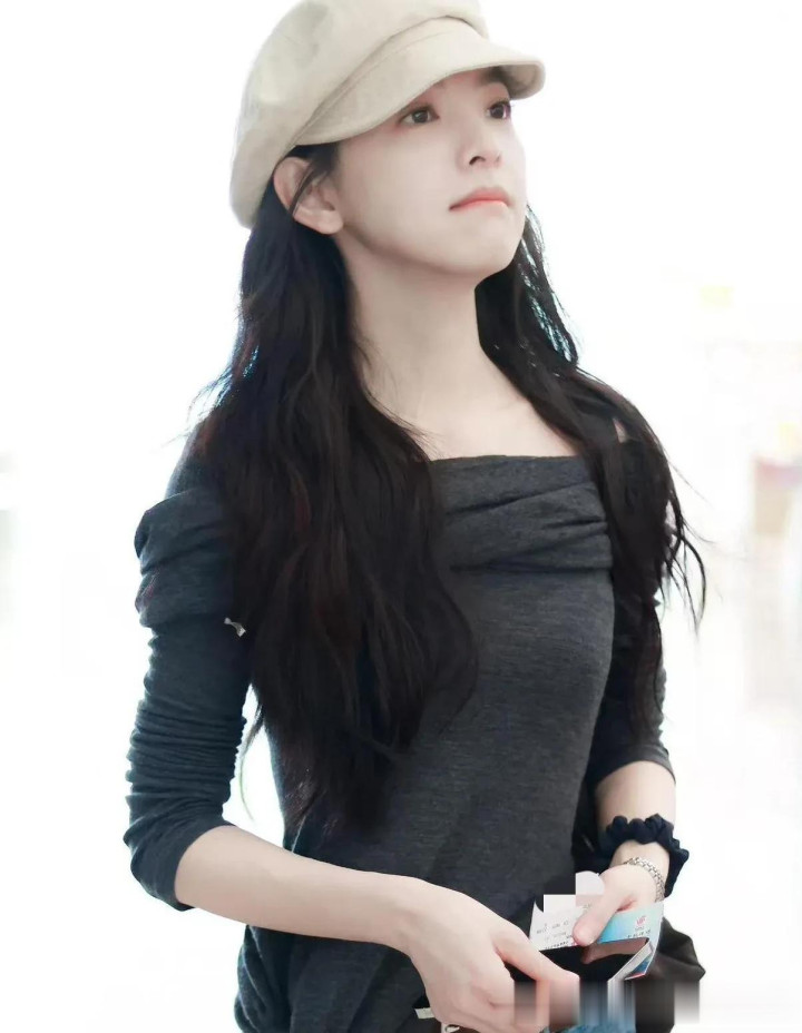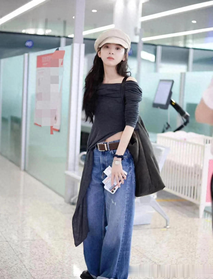 牛牛游戏 章若楠机场穿搭真细腻! 灰色斜肩上衣+牛仔裤+报童帽, 洋气又高等