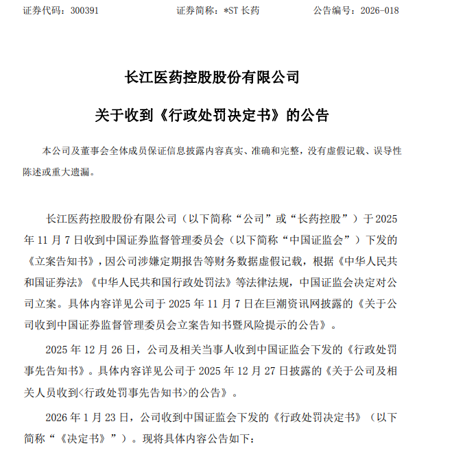 1月23日,证监会对*ST长药(300391)下发《行政处罚决定书》,认定其在2021年至2023年间鸠合三年通过虚增收入与利润进行财务作秀,涉及紧要作恶强制退市情形,深交所同步对公司下发拆伙上市《事前文告书》,运行退市递次。公司股票自2026年1月26日(星期一)开市起停牌。