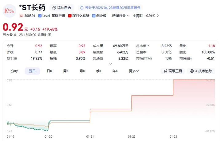 截止1月23日,*ST长药鸠合4个交游日涨停,累计涨幅达109.09%,最新股价报0.92元/股,总市值为3.22亿元。