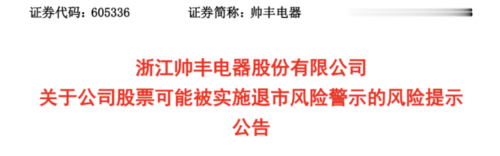 集成灶公司帅丰电器(605336)或将被推论财务类强制退市风险警示。