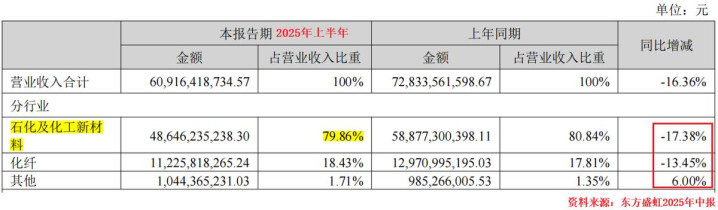 汗漫2025年上半年,“石化及化工新材料”仍然是公司最大营收来源,总营收占比高达79.86%。