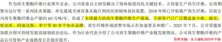 东方盛虹快东谈主一步,2018年就开动量产再生聚酯纤维,当今再生聚酯纤维年产能60万吨,坐拥民众最大的再生聚酯纤维分娩基地,隐蔽迪卡侬、耐克等国表里大客户。