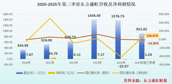 2025年前三季度,东方盛虹营收921.62亿元,同比下滑14.9%;净利润却为1.26亿元,同比增长108.91%。
