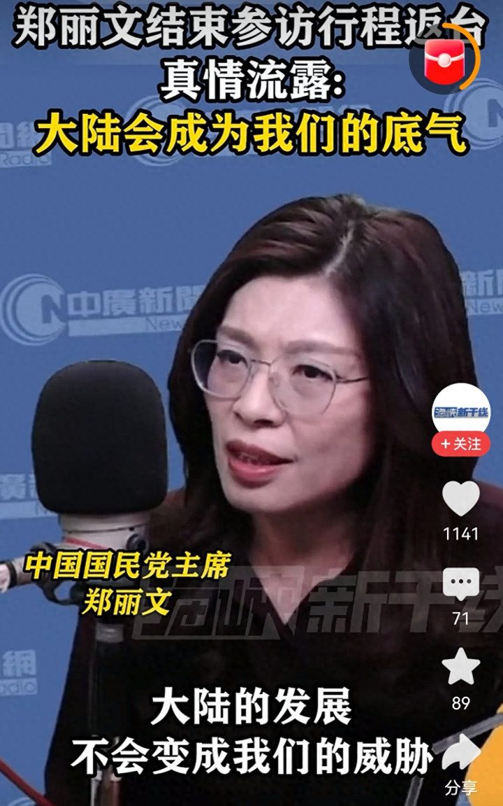 就在今宇宙午,一段郑丽文返台后的真情显现在集聚上刷屏。她说:“大陆的发展不会酿成咱们的威迫,只会成为咱们的底气。