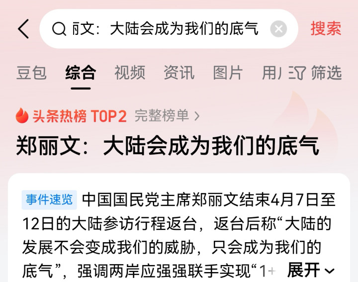 4月15日傍晚,#郑丽文:大陆会成为咱们的底气#冲上热搜第二。
