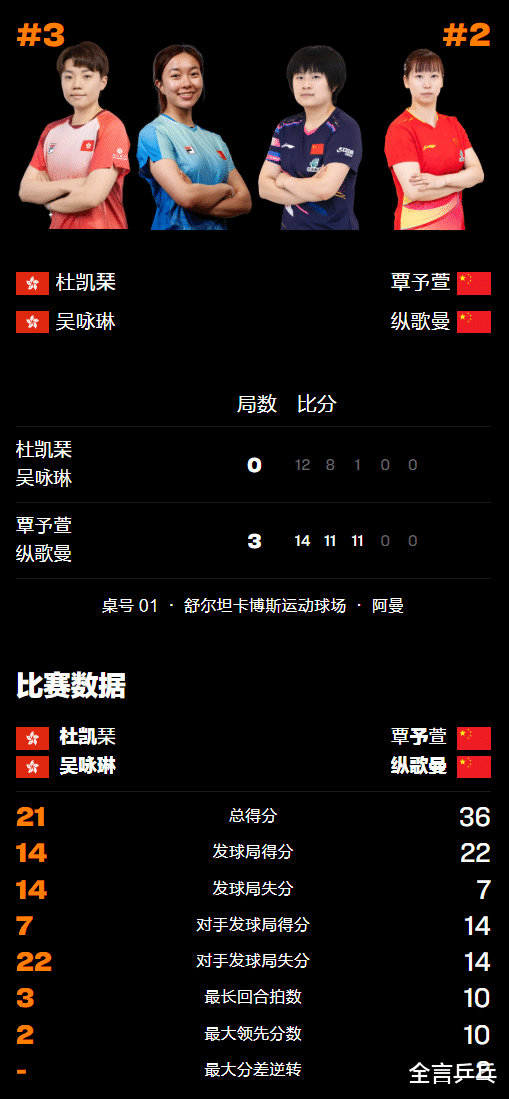2026年1月24日晚,乒乓球WTT马斯喀特通例赛女双决赛隔绝,两位年青新星构成的配对覃予萱/纵歌曼清楚知道3-0打败中国香港组合杜凯琹/吴咏琳称王,第三局更是轰出了11-1的悬殊分差,而这亦然中国乒乓球女队在新年的第一个冠军,可喜可贺!详备战况请看下文。