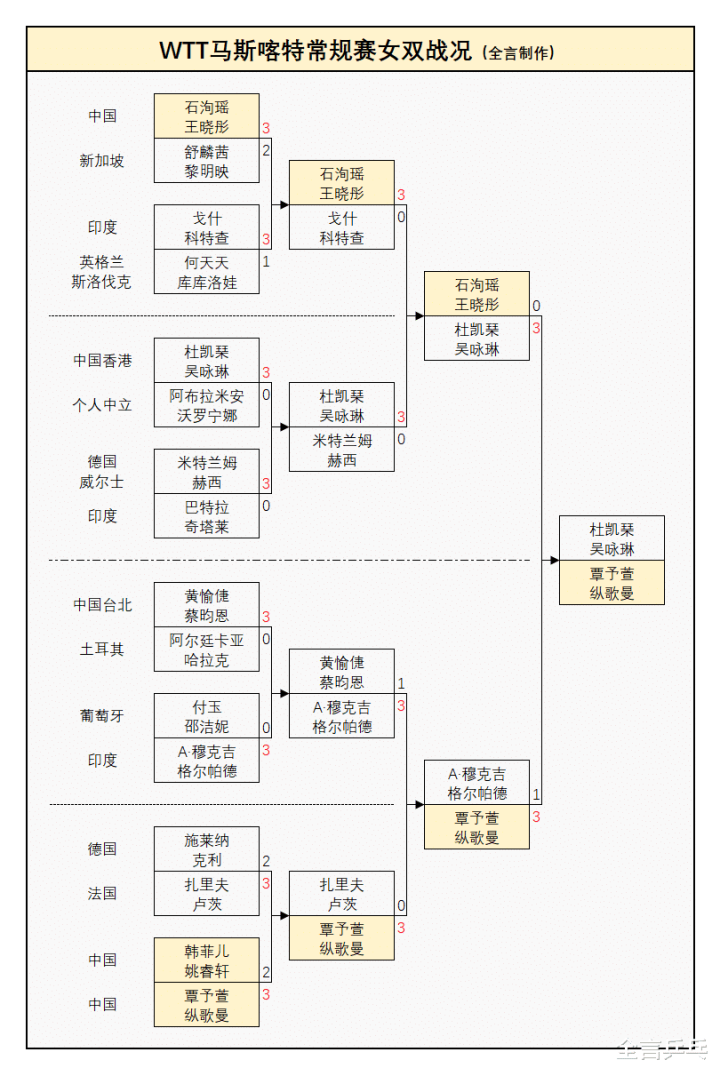 杜凯琹/吴咏琳:3-0阿布拉米安/沃罗宁娜(个东说念主中立)、3-0米特兰姆(德国)/赫西(威尔士)、3-0石洵瑶/王晓彤(中国)。