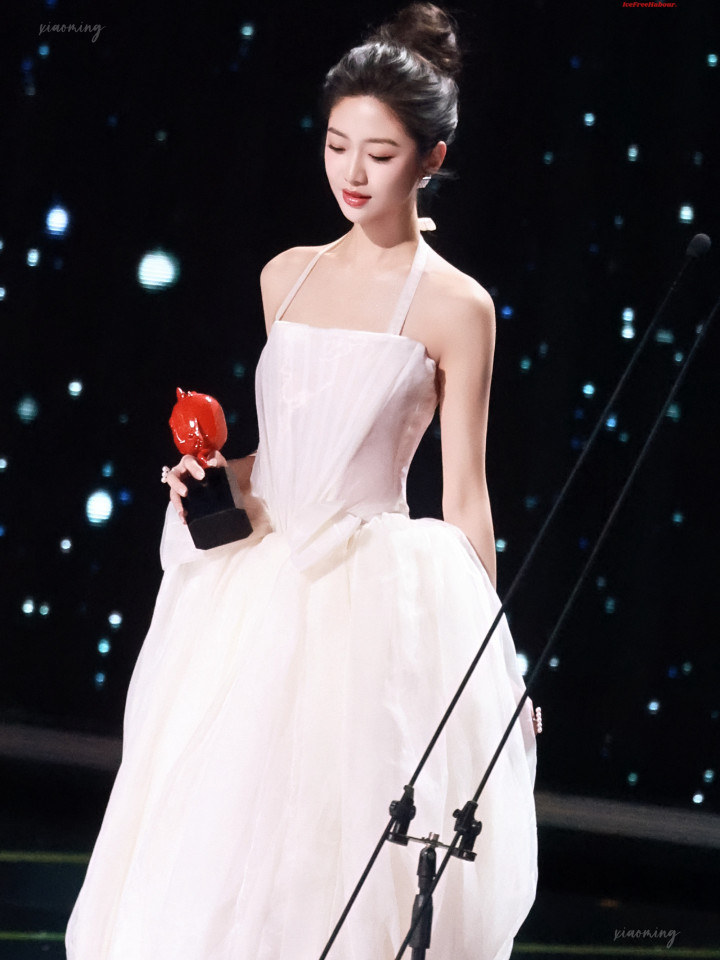 向涵之米白挂脖花苞裙,上身修身下身蓬松,运筹帷幄感完全刚刚好