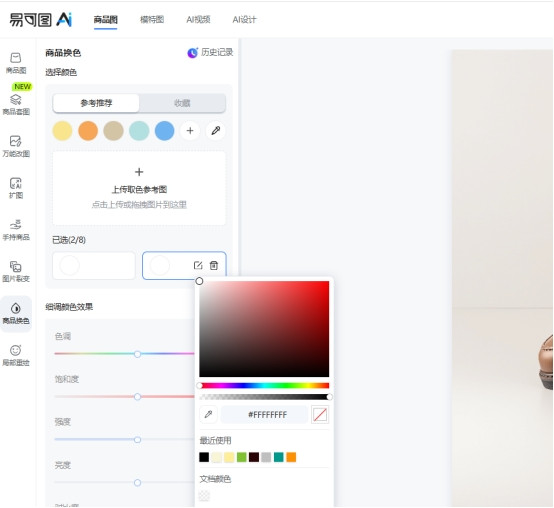 笃定换色区域后,用户不错在页面左侧径直聘用需要替换的心思。系统会提供一个心思轮盘,不错摆脱聘用不同色值,餍足不同商品心思需求。举例服装、鞋子、包包、数码居品等,都不错通过该功能快速生成多种心思版块。