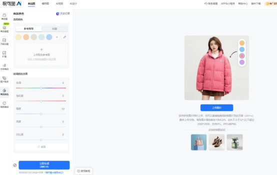 领先,从使用门槛来看,易可图的操作特殊省略。用户只需要上传需要换色的商品图片即可初始操作,系统最大复旧一次上传30张图片,图片尺寸复旧2000×2000以内,这关于电商商品图来说仍是皆备够用。