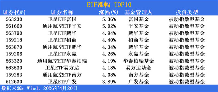 低轨卫星互联网星座建设插足批量组网阶段,贸易航天产业政策密集落地,低空经济写入多地政府使命主义,通用航空装备翻新欺诈引申决议加快鼓励,资金加快涌入贸易航天及低空经济赛谈博弈产业从0到1的爆发弹性,推动卫星及通用航空主题ETF集体走强并占据涨幅榜前哨。