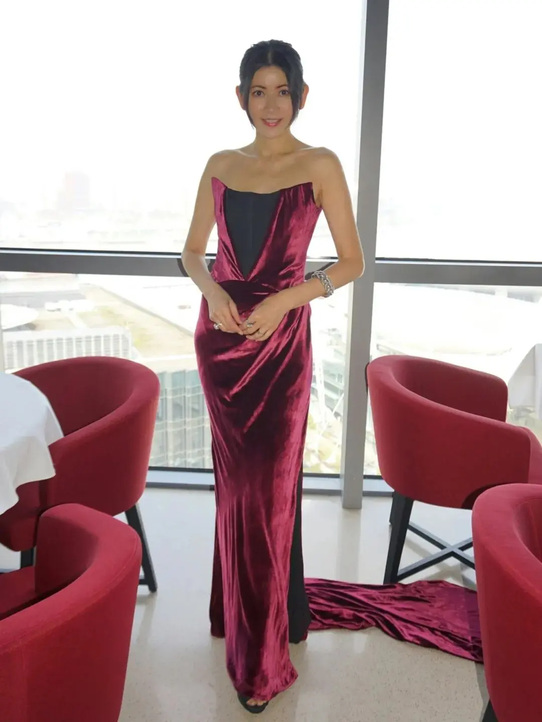 相片中的她,穿戴孑然酒红色丝绒露肩晚装,贴身剪裁把纤细体态足够勾画出来,皮肤白滑紧致,整个东谈主景况好得惊东谈主。若不是报谈写明她照旧54岁,单看相片,如实很难把她和这个年岁想到在沿途。