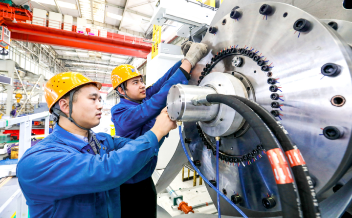 在济南二机床集团有限公司坐褥车间,使命主说念主员在进行压力机装置。图源:经济日报