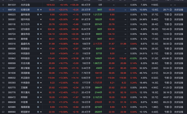 光伏板块大涨!罢休1月23日收盘,光伏开垦(BK1031)报收1616.53,涨幅高达9.14%。其中,东方日升(300118.SZ)、奥特维(688516.SH)、迈为股份(300751.SZ)、隆基绿能(601012.SH)等多只个股涨停,通威股份(600438.SH)等多只个股涨幅卓越7%。