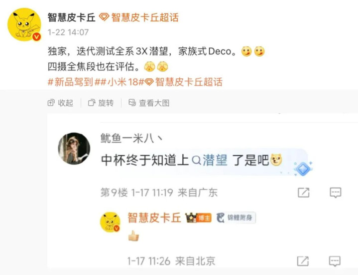 集会爆料所带的话题标签来看,其指的有可能是小米18系列。也等于说,法式版块小米18将搭载潜望长焦。