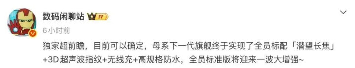 在此之前,博主@数码闲扯站 的一份音信中也提到过,“独家超前瞻,当今不错笃定,母系下一代旗舰终于终显著全员标配「潜望长焦」+3D超声波指纹+无线充+高规格防水,全员法式版将迎来一波大增强~”