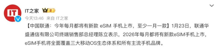 参数IT之家的报谈来看,“联通华盛通讯有限公司终局销售部总司理陈立表露,2026年每月齐将有新款eSIM手机上市,eSIM手机将全面掩饰三大移动OS生态体系和统统主流手机品牌。”