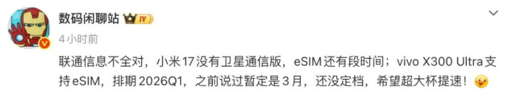 不外,博主@数码闲扯站 的爆料浮现,“联通讯息不全对,小米17莫得卫星通讯版,eSIM还有段时代;vivo X300 Ultra营救eSIM,排期2026Q1,之前说过暂定是3月,还没定档”。