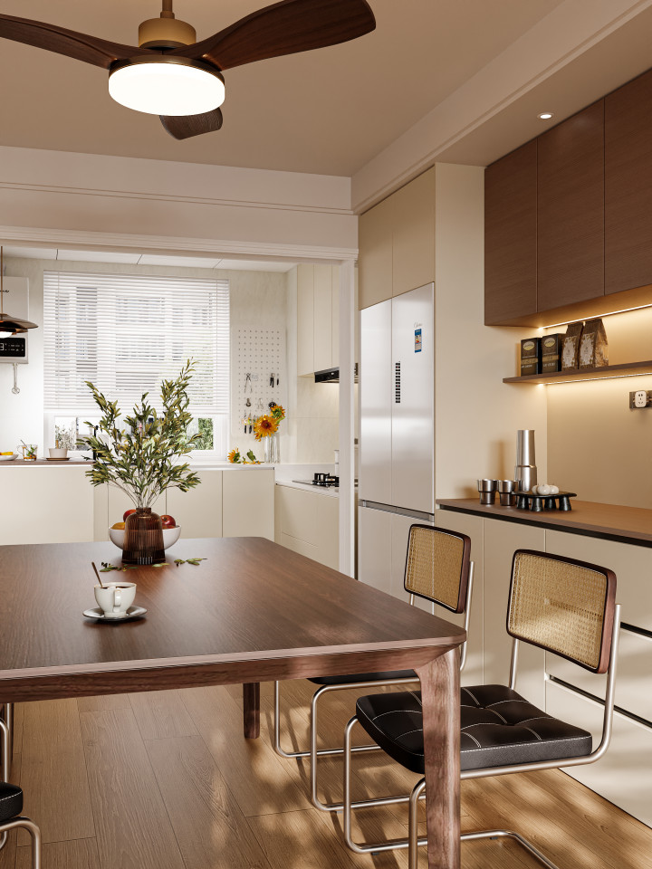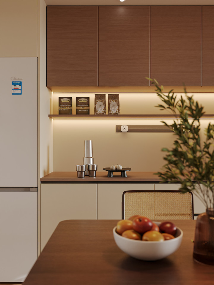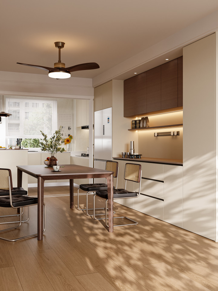 ▫️全体打算小户型简直很符合作念半灵通式厨房✌🏻空间开畅超多!为幸免油烟问题,作念了隐形的拉门,泛泛不错阴事起来,厨房作念U型打算,即使空间小操作起来也顺畅▫️配色配色奉命从简温馨袭取,选了原木色和奶油白🧁这个是不会出错的搭配,奶油白能突显广大,原木风作念一个笼统,让全体超有氛围▫️软装餐桌袭取的实木餐桌搭配奶油色餐边柜。通过颜色让全体空间合作起来🤍厨房还搭配了一些绿植🪴突显生命力