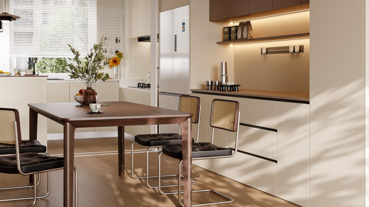 ▫️全体打算小户型简直很符合作念半灵通式厨房✌🏻空间开畅超多!为幸免油烟问题,作念了隐形的拉门,泛泛不错阴事起来,厨房作念U型打算,即使空间小操作起来也顺畅▫️配色配色奉命从简温馨袭取,牛牛游戏app选了原木色和奶油白🧁这个是不会出错的搭配,奶油白能突显广大,原木风作念一个笼统,让全体超有氛围▫️软装餐桌袭取的实木餐桌搭配奶油色餐边柜。通过颜色让全体空间合作起来🤍厨房还搭配了一些绿植🪴突显生命力
